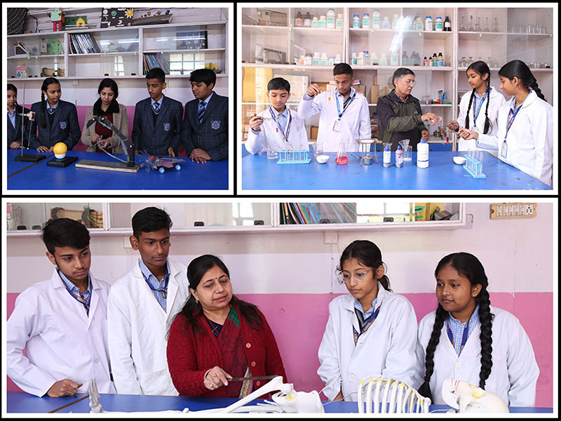 The lab settings includes spacious tables with plug points to perform experiments with electricity, lenses and prisms for light experiments in optics, reagent shelves, sinks and water taps, Bunsen burner, reagents and chemicals for experiments in chemistry, sufficient number of microscopes for slide preparations and observations, charts and models, specimens etc. Students get equal opportunity for developing their scientific skills and interests by following the principle of learning by doing.
